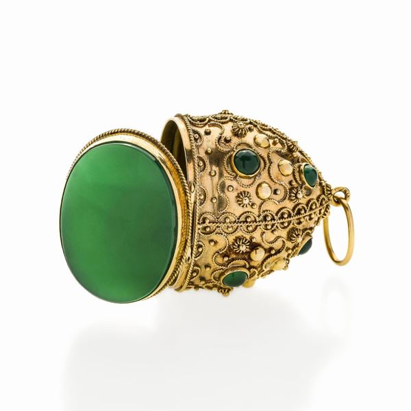 MATERIALE: oro giallo e giada DESCRIZIONE: pendente realizzato come una cupola interamente impreziosita da motivo a nastro in oro alternata a piccole giade taglio cabochon, base apribile in giada MISURE: cm 3x5 PESO: gr 23