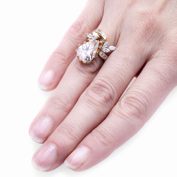 MATERIALE: oro giallo e diamanti DESCRIZIONE: anello di ispirazione floreale, realizzato con diamante taglio goccia impreziosito da piccoli diamanti taglio navette, fascia con diamanti taglio brillante su ambo i lati MISURE: diamtero interno 19 PESO: diamante taglio goccia di ct 5.07, colore giallo bruno, purezza VVS2, Naturale Tipo IIA, corredato di certificato CISGEM n 11800IIA, gr 8.6