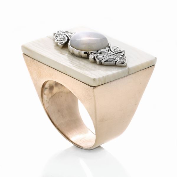 MATERIALE: oro rosa, osso, oro bianco, diamanti e opale DESCRIZIONE: anello a ponte con alta base in oro su cui poggia una parte in osso impreziosita con opale e rose di diamante, reca il marchio 375 MISURE: anello 17 PESO: gr 13.0