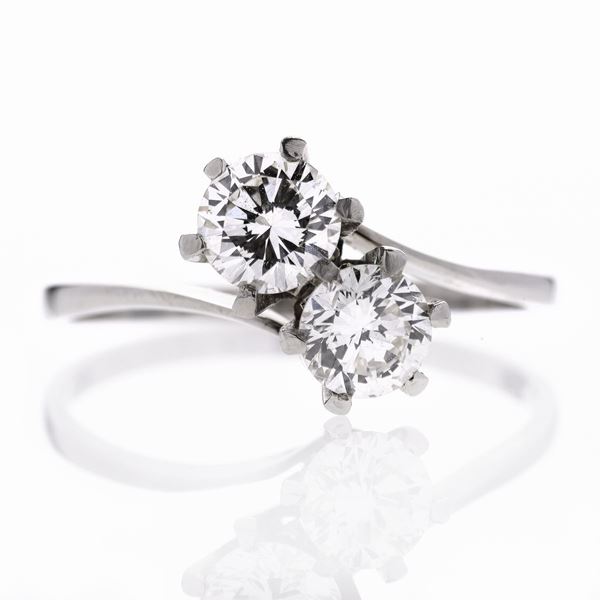 MATERIALE: oro bianco e diamanti DESCRIZIONE: anello contrariè realizzato con due diamanti taglio brillante montati con griffe MISURE: anello 22 PESO:diamanti ct 0.70, colore j-K, purezza VVS-VS e 0.61, colore J-K, purezza VVS-VS, gr 2.4