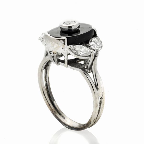 MATERIALE: oro biacno, onice e diamanti DESCRIZIONE. anello realizzato con diamante taglio brillante su base ovale in onice incorniciata da due diamanti taglio navette per lato MISURE: anello 6 PESO: diamanti ct 0.90, gr 3.7