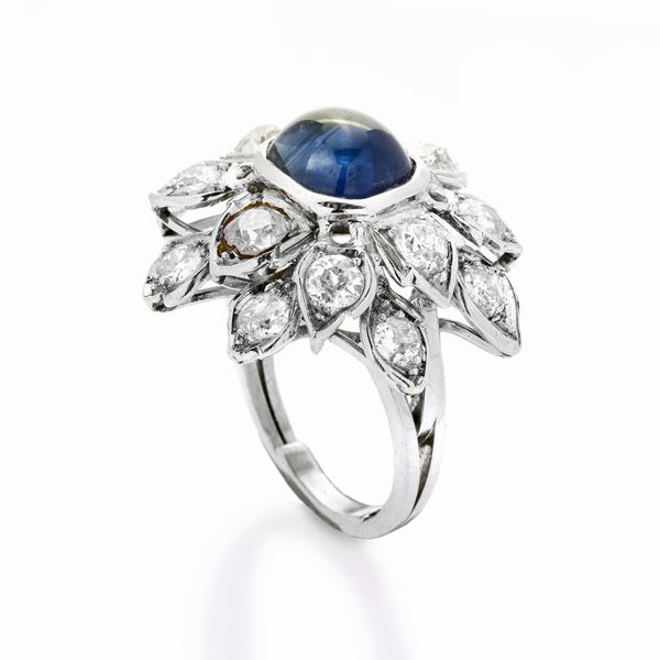 MATERIALE: oro bianco, diamanti e zaffiri DESCRIZIONE: anello a fiore con zaffiro taglio cabochon ovale impreziosito, in ogni petalo, con diamante taglio vecchio MISURE: anello 12 PESO: zaffiro ct 3.20, diamanti ct 2.20, gr 13.3