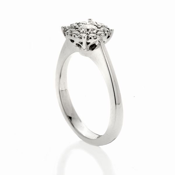 MATERIALE: oro biacno e diamanti DESCRIZIONE: anello con diamante taglio brillante incornciato con diamanti più piccoli, reca il marchio 750 MISURE: anello 13.5 PESO: diamante centrale ct 0.25 circa, diamanti di contorno ct 0.20, gr 4.8