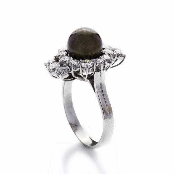 MATERIALE: oro bianco, diamanti e perla brown DESCRIZIONE: anello realizzato con al centro una perla brown su base sagomata impreziosita con diamanti taglio brillante MISURE: anello 18 PESO: perla mm 9, diamanti ct 1.80 circa, gr 6.8