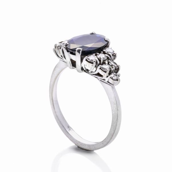 MATERIALE: oro bianco, diamanti e zaffiro DESCRIZIONE: anello realizzato con zaffiro taglio ovale impreziosito con sei diamanti taglio brillante disposti in modo piramidale per ogni lato MISURE: anello 17 PESO: gr 5.1