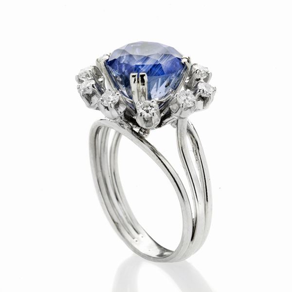 MATERIALE: oro bianco, diamanti e zaffiro naturale Ceylon DESCRIZIONE: anello con al centro zaffiro naturale di taglio cuscino incorniciato con dieci diamanti taglio brillante, reca il marchio 18 kt MISURE: anello 13 PESO : zaffiro naturale ct 6.40, corredato di certificato Gemmological Certification Services n. 78160-38 del 13.06.2018, gr 8.2