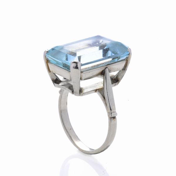 MATERIALE: oro bianco e acquamarina DESCRIZIONE: anello realizzato con grande acquamarina di taglio rettangolare su alta base in oro bianco MISURE: anello 10 PESO. acquamarina ct 11.50 circa, gr 7.7