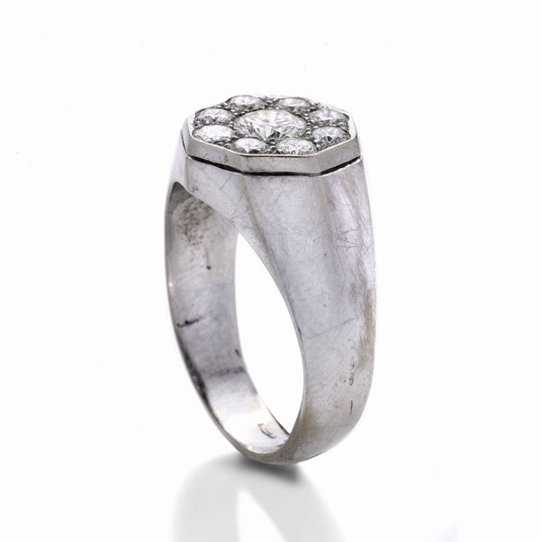 MATERIALE: oro bianco e diamanti DESCRIZIONE: anello di forma esagonale realizzato con al centro diamante taglio brillante incorniciato da otto diamanti taglio brillante più piccoli MISURE: anello 26 PESO: diamante centrale ct 0.65, laterali ct 0.80, colore I, purezza VS, gr 9.8