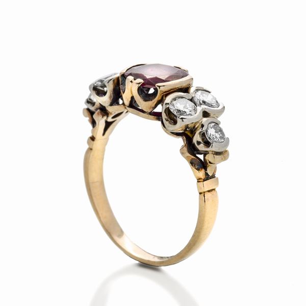 Anello in oro giallo, argento, diamanti e rubino