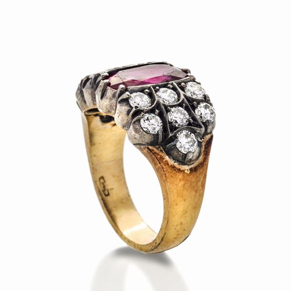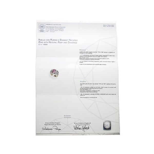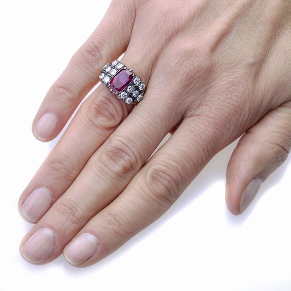 Anello in oro giallo, argento, diamanti e Rubino Birmano Naturale