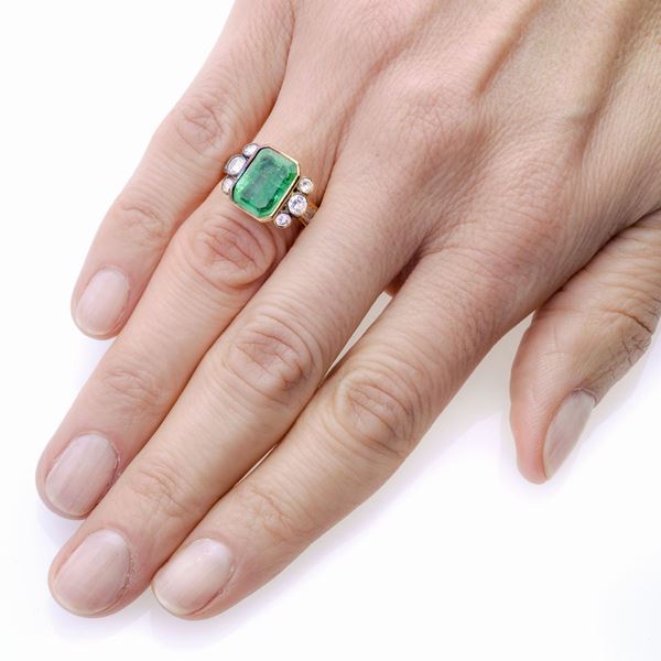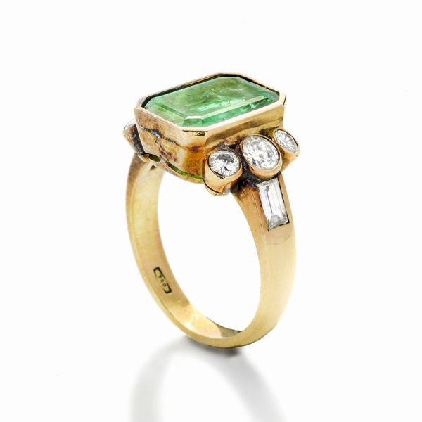 Anello in oro giallo, diamanti e smeraldo