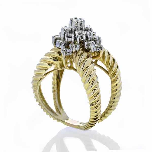 MATERIALE: oro giallo, oro biacno e diamanti DESCRIZIONE: anello di ispirazione floreale con diamanti taglio brillanti disposti in modo piramidale su particolare base realizzata in quattro parti, ciascuna a torchionne MISURE: anello 15 PESO: gr14