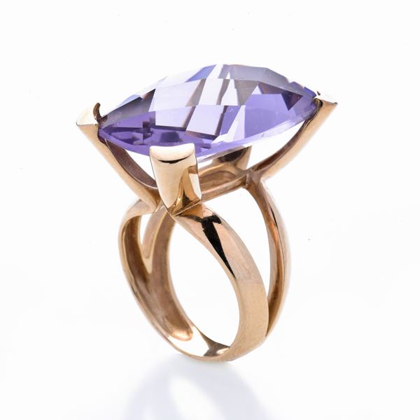 MATERIALE.oro rosa e quarzo viola DESCRIZIONE: anello realizzato con grande quarzo taglio rettangolare briolette montato su alte griffe, reca il marchio 750 MISURE: anello 13 PESO: gr 11.8