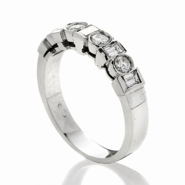 MATERIALE: oro bianco e diamanti DESCRIZIONE: anello riviere realizzato con diamanti taglio vecchio alternati a diamanti taglio baguette, reca il marchio 750 MISURE: anello 20 PESO: diaamnti ct 1.0, colore H, purezza VS, gr 6.2