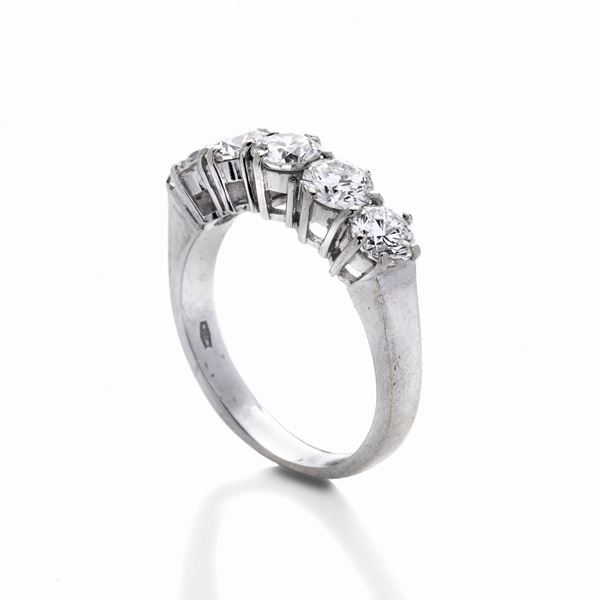 MATERIALE: oro bianco e diamanti DESCRIZIONE: anello riviere realizzato con cinque diamanti taglio brillante, reca il marchio 750 MISURE: anello 12 PESO: diamanti ct 1.40, colore G-H, purezza VVS-VS, gr 4.4