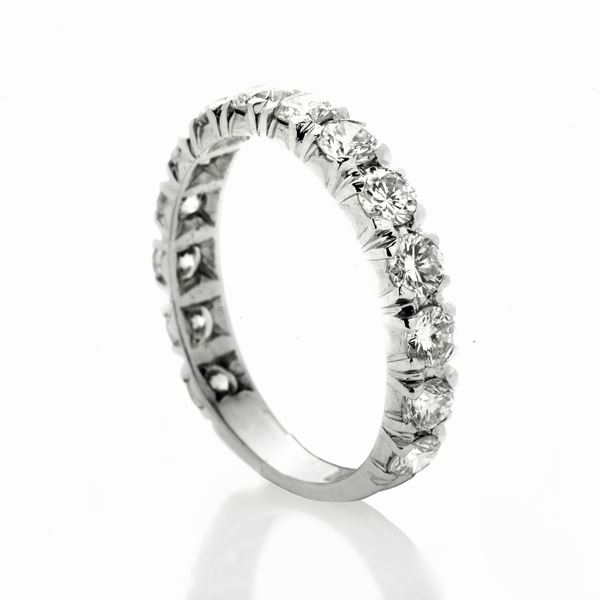 MATERIALE: oro bianco e diamanti DESCRIZIONE. anello riviere con quattordici diamanti taglio brillante montati con griffe MISURE: anello 16 PESO: diamanti ct 1.30, colore I, purezza VS, un diamante scheggiato, gr 3.1