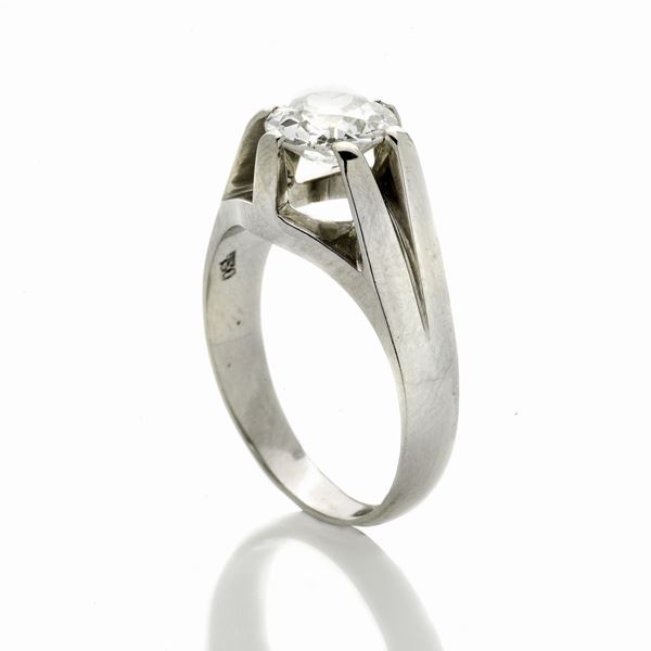 MATERIALE: oro bianco e diamante DESCRIZIONE: anello solitario con diamante taglio vecchio su alta base in oro bianco, reca il marchio 750 MISURE: anello 21 PESO: diamante ct 1.70, colore K, purezza SI, gr 8.4