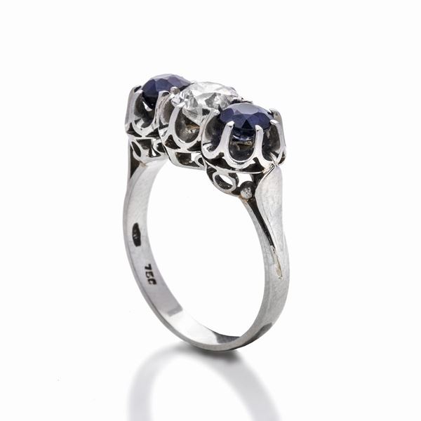 Anello trilogy in oro bianco, diamanti e zaffiro