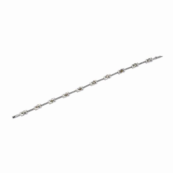 MATERIALE:oro bianco, diamanti e diamanti brown DESCRIZIONE: bracciale realizzato con maglie a barretta impreziosite con piccoli brillanti alternate con maglie a nodo, ciascuna con diamante brown taglio brillante MISURE: aperto cm 18.2 PESO: diamanti fancy ct 0.80, diamanti ct 0.36, gr 20.3