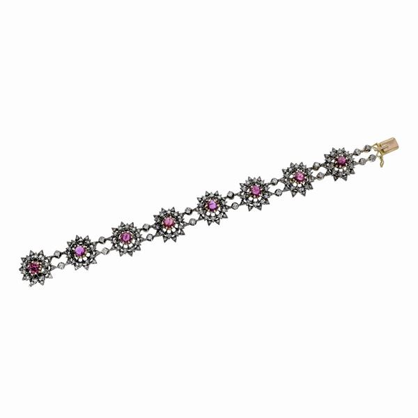 MATERIALE: oro giallo, argento, diamanti e rubini DESCRIZIONE: bracciale realizzato con otto placche modellate come fiori, ciascuno centrato da rubino ed impreziosito con diamanti taglio vecchio, placche unite le une alle altre da due maglie con diaamnti taglio vecchio MISURE: aperto cm 16 PESO: gr 24.1