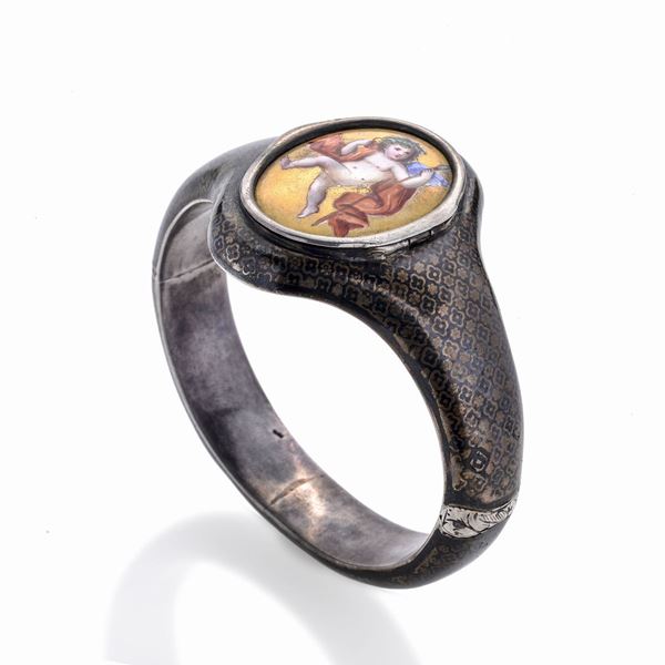 MATERIALE: argento DESCRIZIONE: bracciale rigido centrato da miniatura dipinta raffigurante putto alato, a nascondere vano apribile, bracciale in argento lavorato a niello a formare motivi floreali stilizzati, reca un punzone forse francese, di difficle lettura MISURE: diametro interno 6 PESO: gr 45.8