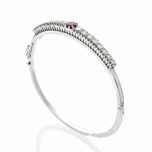 MATERIALE: oro bianco, diamanti e rubino DESCRIZIONE: bracciale rigido realizzato con rubino tra diamanti taglio brillante degradè per ciascun lato MISURE: chiuso diametro interno cm 5 PESO: diamanti ct 1.0 circa, gr 14.9