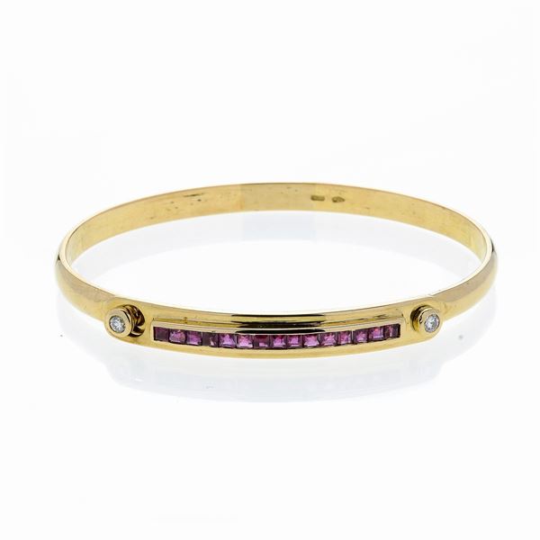 MATERIALE: oro giallo, diamanti e rubini DESCRIZIONE: braciale rigido con inserto impreziosito con rubini taglio carrè e due diamanti taglio brillante, reca il marchio 750 MISURE: diametro interno cm 5.5 PESO: gr 18.0