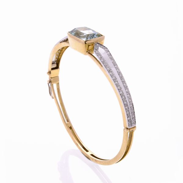 MATERIALE: oro giallo, oro bianco, diamanti e acquamarina DESCRIZIONE: bracciale rigido realizzato con acquamarina taglio rettangolare tra due volute impreziosite con diamanti taglio MISURE: chiuso cm 6 PESO: gr 21.5