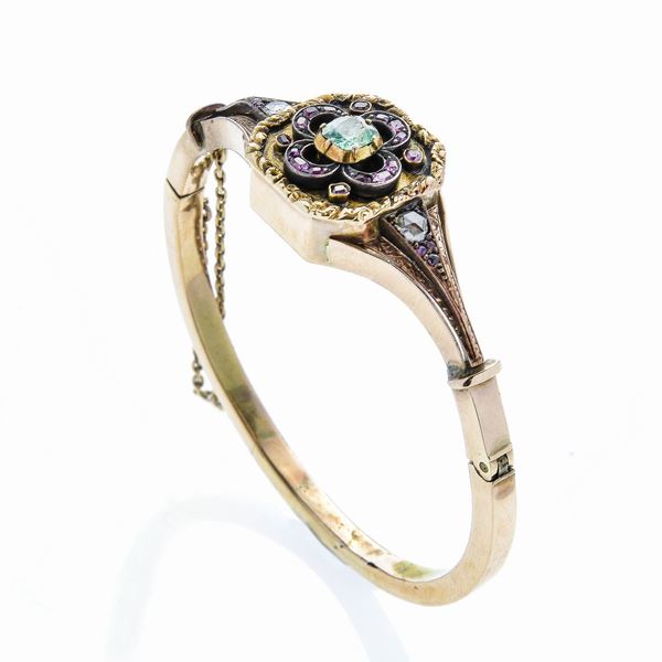 MATERIALE: oro rosa, oro giallo, diamanti, smeraldo e pietre DESCRIZIONE: bracciale rigido con parte centrale quadrata impreziosita con smeraldo e pietre rosse incorniciati da fascia incisa con volute, ai lati rose di diamanti, reca un punzone di diffcile lettura, forse dell'oro francese MISURE: chiuso diametro cm 5 PESO. gr 18.9