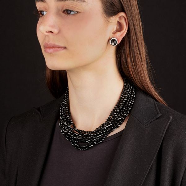 MATERIALE: oro bianco, diamanti e onice DESCRIZIONE: collana millefili in perle di onice con grande fermezza realizzata a spirale interamente impreziosita con diamanti taglio brillante e centrata con diamante taglio vecchio, paio di orecchini a clip en suite, ciascuno con onice taglio cabochon e diamante taglio vecchio, recano il marchio 750 MISURE: collana aperta cm 40, orecchini diametro cm 1.5 PESO: collier diamanti ct 3.80, orecchini ct 0.26, gr 150.9