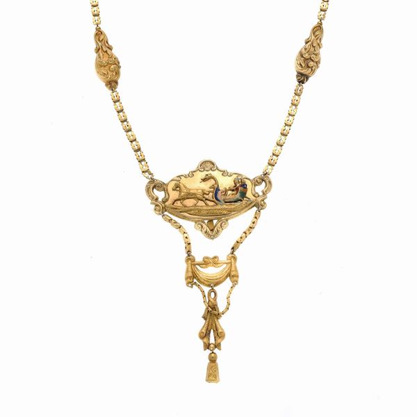 MATERIALE: oro giallo e smalti nei toni del verde, blu, bianco e giallo DESCRIZIONE: collana realizzata con doppie maglie intrecciate impreziosite da parti realizzate a sbalzo con volute contrapposte, placca centrale sagomata sormontata da conchigliaa e cenrata da un calesse impreziosito con smalti di vari colori, lungo pendente con fiocco e drappeggio MISURE: aperta cm 43 PESO: gr 11.3