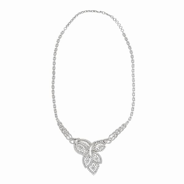 MATERIALE:oro bianco e diamanti DESCRIZIONE: collier di ispirazione floreale con al centro grandi foglie realizzate a tricot e impreziosite con diamanti taglio brillante che continuano ai lati sul motivo a treccia MISURE: aprto cm 48.5 PESO: diamanti ct 2.50, colore H, purezza VS, gr 47.2