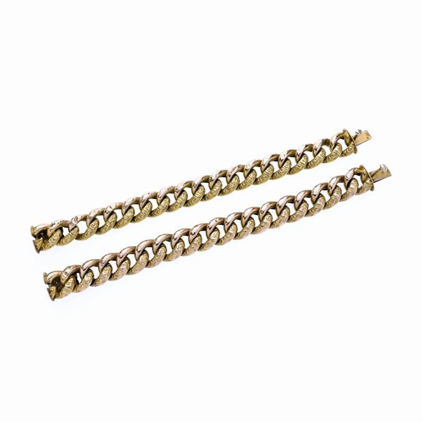 MATERIALE: oro giallo e oro rosa DESCRIZIONE: coppia di bracciali realizzati con maglie a barbazzale bicolori in parte sbalzate con fiori, unibili a formare un girocollo, recano il marchio dell'oro francese, lievi ammaccature, chiusura con difetti MISURE: ciascuno cm 20.5 PESO: gr 45.9