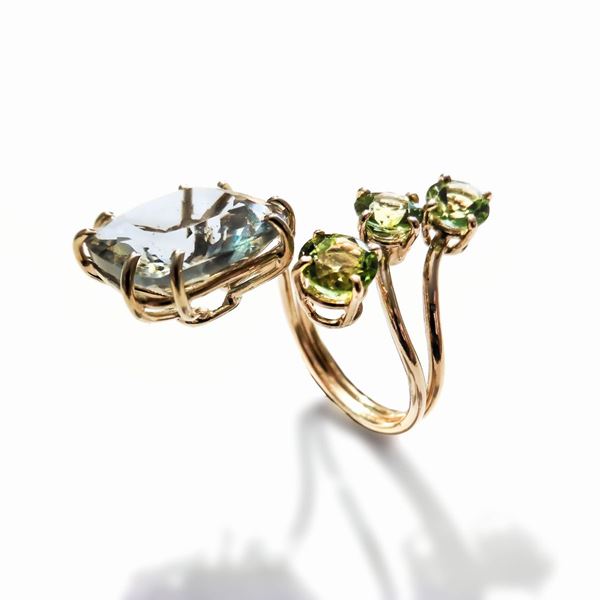 MATERIALE: oro giallo e quarzi colorati DESCRIZIONE: anello realizzato coem una losanga stilizzata con grande quarzo azzurro taglio quadrato ed altre tre più piccoli nei toni del verde, reca il marchio 750 MISURE: anello 15 PESO: gr 8.3