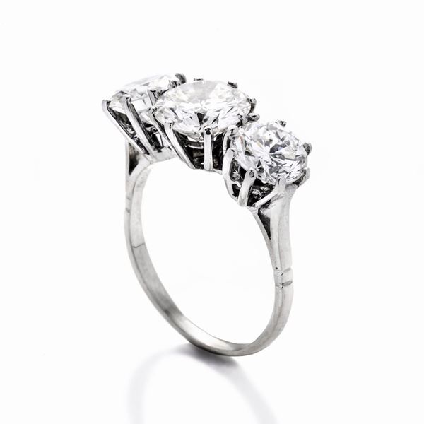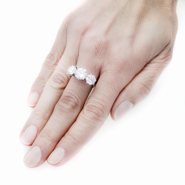 MATERIALE: oro bianco e diamanti DESCRIZIONE: anello trilogy con tre diamanti taglio brillante montati con alte griffe MISURE: anello 17 PESO: diamante centrale ct 2.20, colore L, purezza VS, diamanti laterali ct 1.25 ciascuno, colore J, purezza uno VVS2 e l'altro VS1, pietra centrale con media fluorescenza, pietre laterali fluorescenza inerte, misure della pietra centrale (ct 2.20) diametro minimo mm 8.52, diametro massimo mm 8.65, pietre laterali: diametro minimo mm 7.02 e massimo mm 7.08, gr 4.2