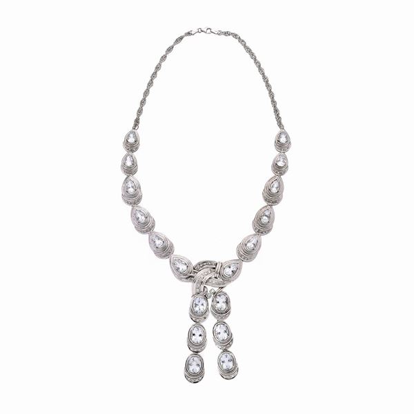 MATERIALE: oro bianco, diamanti e acquamarina DESCRIZIONE: importante collier a "Cravatta" reealizzato con grandi maglie a goccia, ciascuna centrata da acquamarina taglio goccia impreziosita con diamanti taglio brillante, al centro doppio pendente anch'esso con maglie ovali, ciascuna centrata da acquamarina, incornciata con diamanti taglio brillante, reca il marchio 750 MISURE: aperta cm 42.5 PESO: acquamarina ct 29.80, diamanti ct 0.90 , purezza SI, un diamante mancante, gr 75.80