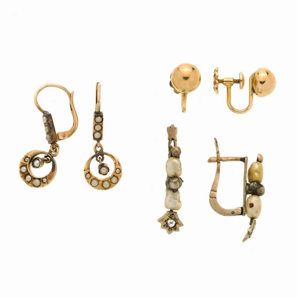 Lotto di tre paia di orecchini in oro giallo, oro a basso titolo e microperle