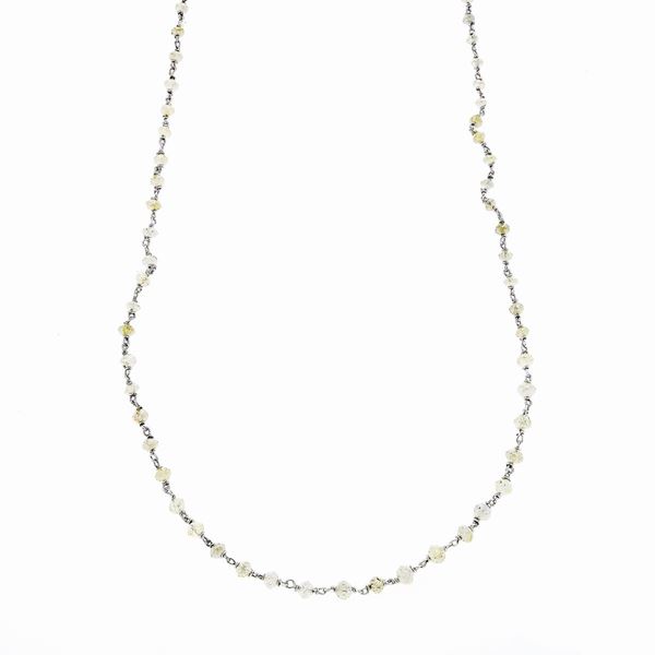 MATERIALE: oro bianco e diamanti DESCRIZIONE: lunga collana realizzata con maglie intrecciate alternate a diamanti sfaccettati, reca il marchio 750 MISURE: aperta cm 102 PESO: diamanti ct 10.50 circa, gr 8.0