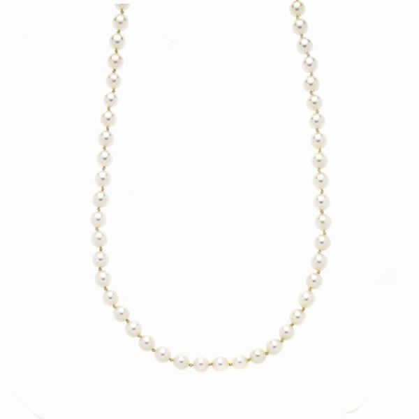 MATERIALE: perle coltivate e oro biacno DESCRIZIONE: lungo filo in perle coltivate con fermezza realizzata come una boulle in oro biacno satinato, reca il marchio 750 MISURE: aperta cm 97.5 PESO: diametro perle mm 6, gr 48.5