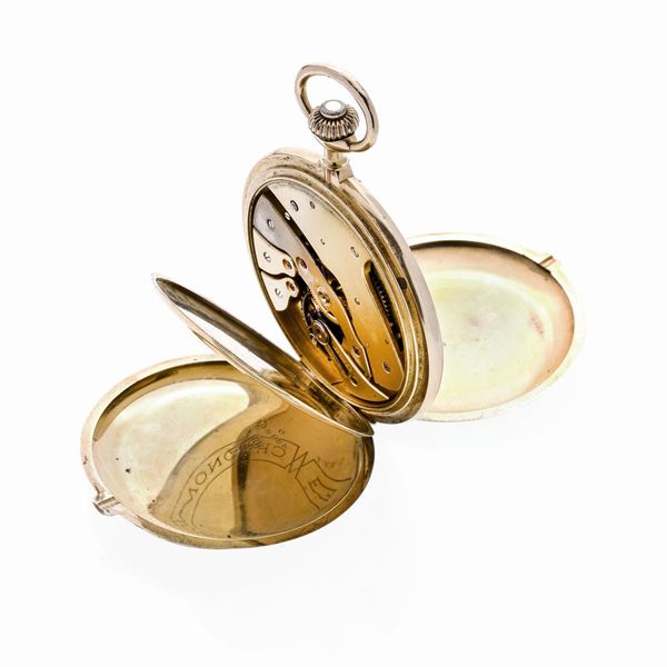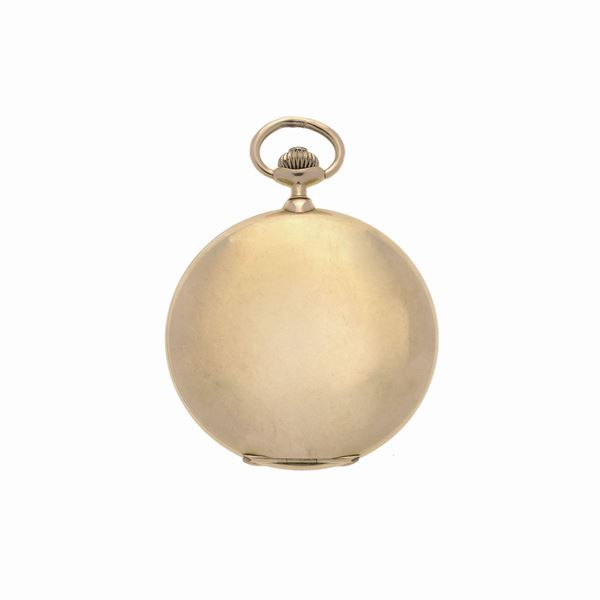 MATERIALE: oro giallo DESCRIZIONE: orologio da tasca cronometro con doppia cassa in oro liscio, corona di carica a ore 3, quadrante in smalto con ore in numeri arabi, quadrante ausiliario per i secondi ad ore 6, movimento a carica manuale, da revisionare MISURE: quadrante mm 55 PESO: gr 117.5