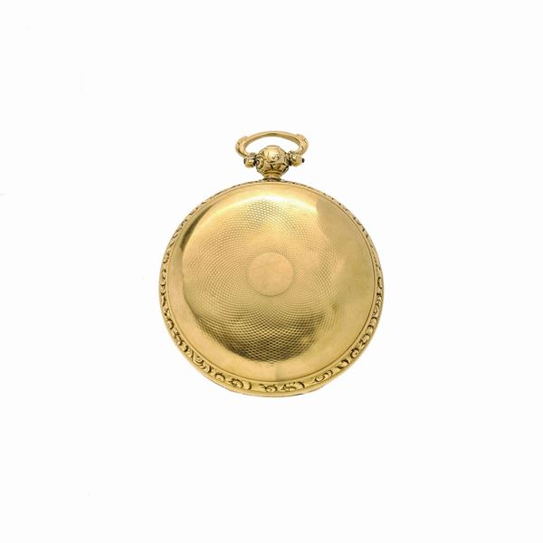 MATERIALE: oro giallo DESCRIZIONE: orologio da tasca, quadrante in oro giallo inciso a raggiera con volute contrapposte, numeri romani in oro giallo, lancette piriformi, movimento a carica manuale, corredato da catena a maglie romboidali e chiavetta, da revisionare MISURE: quadrante mm 43 PESO: gr 66.6