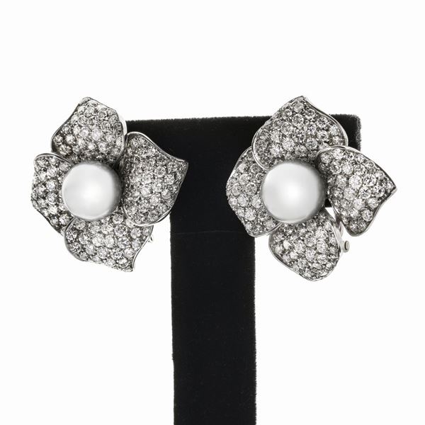 MATERIALE: oro bianco, diamanti e perle tahiti DESCRIZIONE: paio di clips realizzate come un fiore, ciascuna centrata da perla tahiti e impreziosita con grandi petali con pavè di brillanti, trasformabili in paio di orecchini, recano il marchio 750 MISURE: clips diametro cm 2.5 PESO: perla tahiti mm 11, diamanti ct 12.0, colore G, purezza VS, gr 27.70