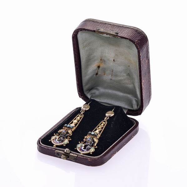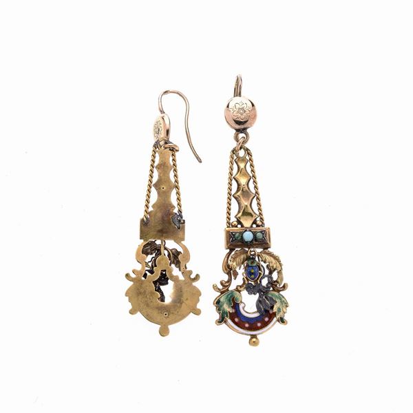 Paio di orecchini pendenti in oro giallo, argento, turchese e smalti colorati
