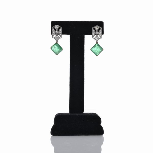 MATERIALE: platino, oro giallo, diamanti e smeraldi DESCRIZIONE: paio di orecchini pendenti, ciascuno realizzato con clipa tricot, di ispitrazione geometrica, interamente impreziosita con diamanti taglio vecchio e smeraldo taglio rettangolare pendente MISURE: cm 1 x 3.2 h PESO: gr 6.6
