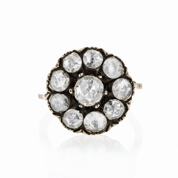 MATERIALE: oro a basso titolo e diamanti DESCRIZIONE: anello a margherita interamente impreziosito con diamanti taglio rose coronè MISURE: anello 13 PESO: diamanti ct 1.85, gr 4.0