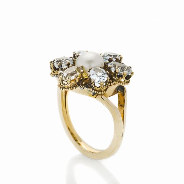 Anello a margherita in oro giallo, acquamarina, topazio e perla mabè