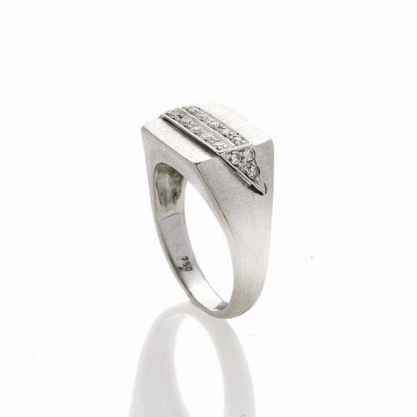 MATERIALE: oro bianco e diamanti DESCRIZIONE: anello rettangolare con al centro due file di piccoli diamanti taglio vecchio e ai lati due elementi triangolari impreziositi da diamanti taglio vecchio, reca il marchio 750 MISURE anello 6 PESO: diamanti ct 0.35, gr 4