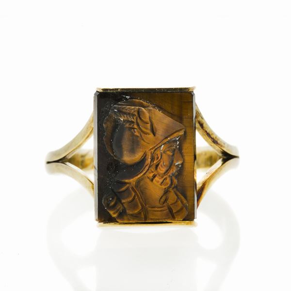 MATERIALE: oro giallo e occhio di tigre inciso DESCRIZIONE: anello chevalier realizzato con occhio di tigre inciso con profilo di guerriero, reca incisa una dedica con la data 3-XI-36 MISURE: anello 19 PESO: gr 6.1