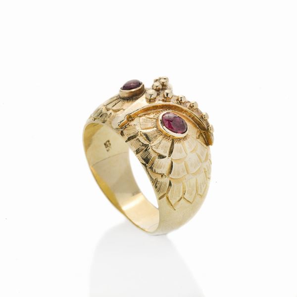 MATERIALE: oro giallo e rubini DESCRIZIONE: anello realizzato come una testa di gufo, con occhi in rubini e becco stilizzato, reca il marchio 750 MISURE: anello 18 PESO: gr 13.8