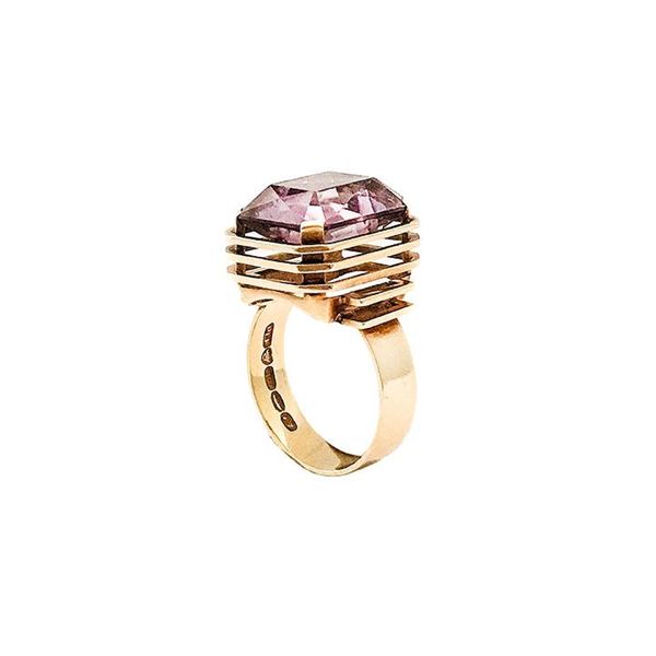 MATERIALE: oro a basso titolo e ametista DESCRIZIONE. anello realizzato con una grande ametista di taglio rettangolare su alta base di ispirazione geometrica, reca il marchio 585 MISURE: anello 14 PESO: gr 6.6